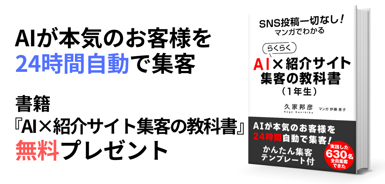 | 書籍『AI✕紹介サイト集客の教科書』 | 無料 | なぜ、9割の人がAIを活用して集客できないのか?その3つの理由と、解決策を提示します。 |
